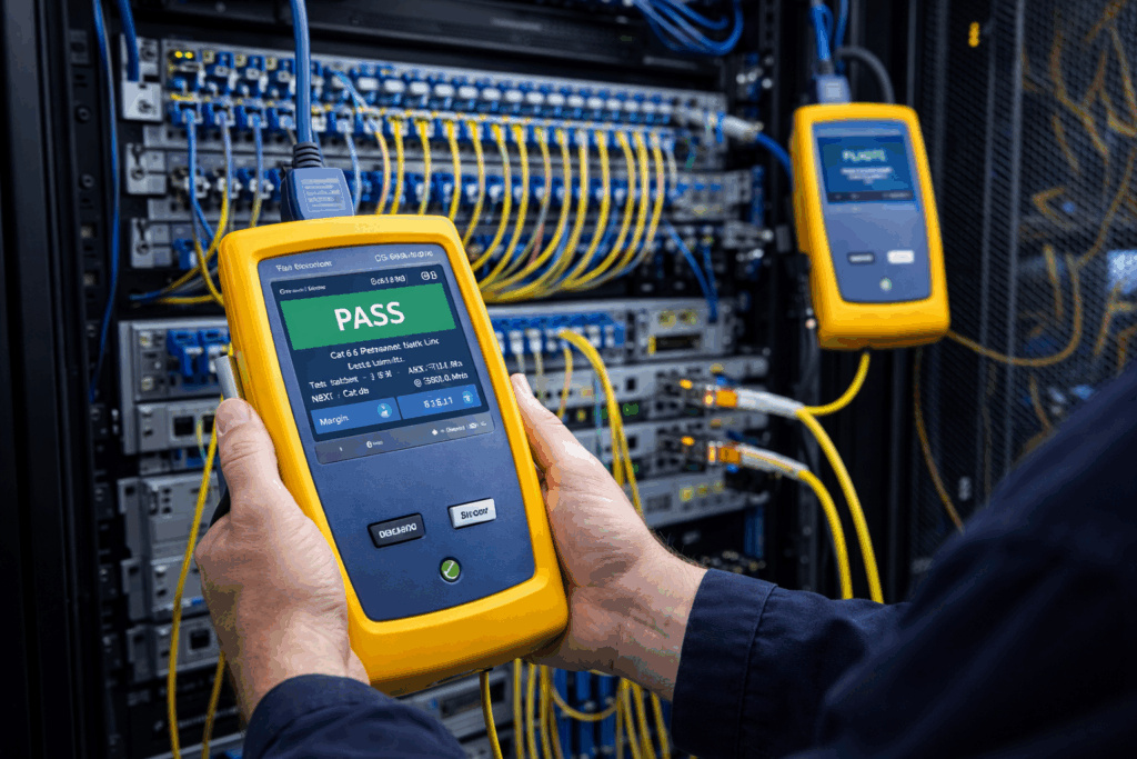 Kwaliteit stopt niet bij aanleg. Wij leveren pas op als alles klopt. Daarom certificeren we onze datanetwerken volledig, met systemen van onder andere Panduit en Nexans. We voeren metingen uit met specialistische apparatuur. Zo weet je zeker dat je netwerk voldoet aan alle eisen: betrouwbaar, snel en klaar voor intensief gebruik.